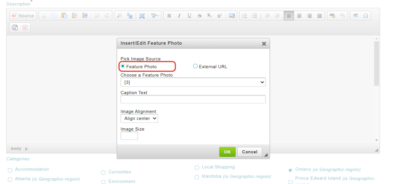 Next, in the pop up select “Feature Photo” and then from the drop down select the image from your uploaded gallery that you wish to add to the description box.
