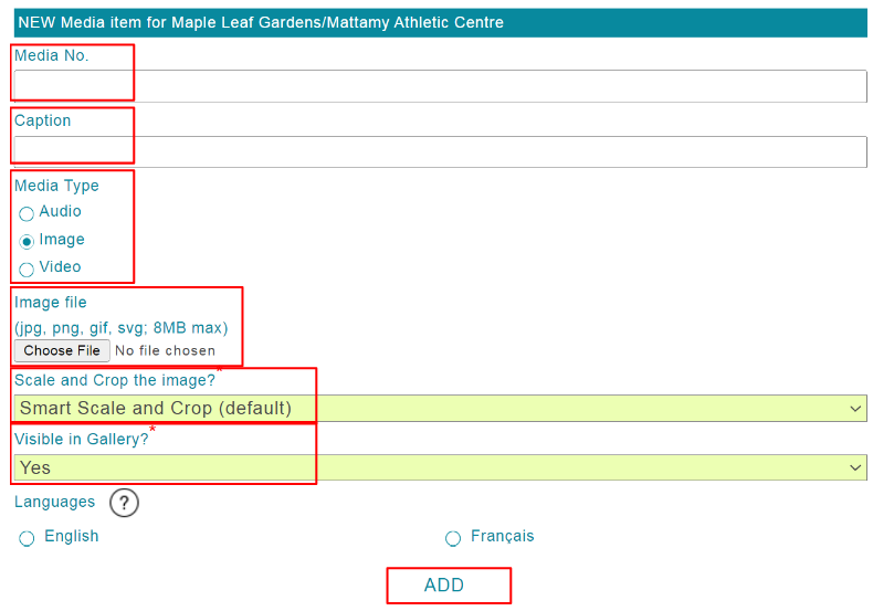 Under ‘Media Type’ select ‘Image’ since we will add a photo first. Click the ‘Choose File’ button to select the image you want to upload. JPG, PNG, GIF and SVG formats are supported (8MB max). You will need to navigate to the folder on your computer where that image is saved and select it. When you’ve selected your image, click ADD at the bottom of your screen.
