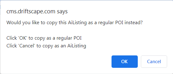 When you copy an AiListing, you will be prompted to confirm whether you want to copy as an AiListing or convert it into a regular POI (if your plan has room to do so):