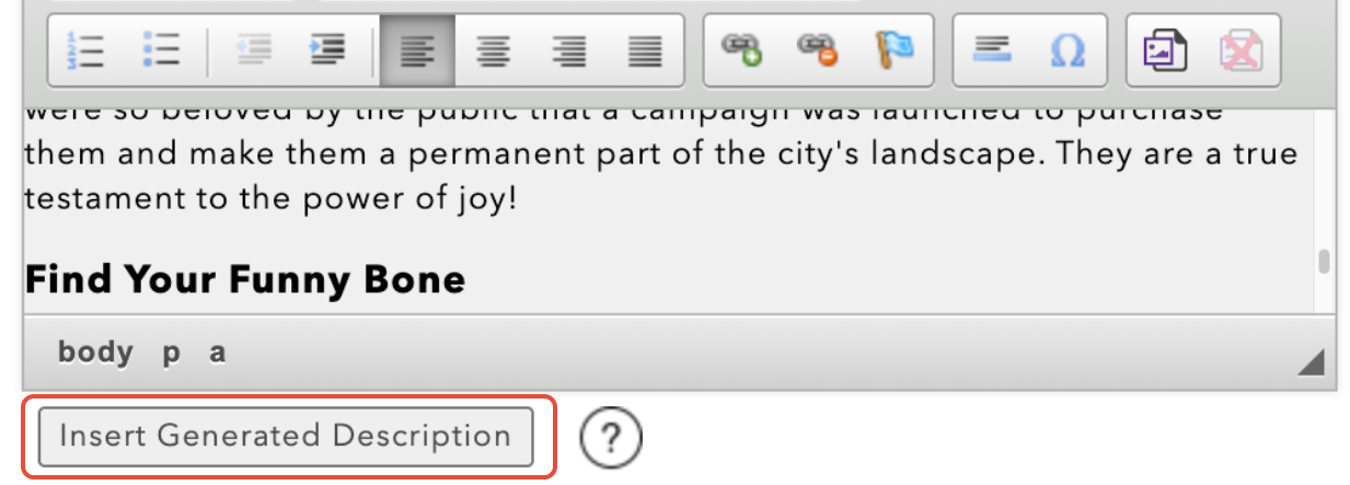 Insert Generated Description: once an AiListing is created, you may find that you want to edit ot tweak some of the text. This can be done, by clicking the 'Insert Generated Description' button. It will copy the current generated description text into the content editor, allowing you to change it. This button is not displayed if the content has not yet been generated. Make sure you set the 'AiListing Description replacement' option to 'Replace description'.