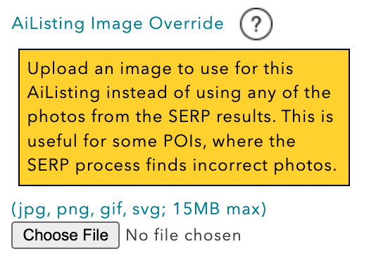 AiListing Image Override (optional): if the automatically collected images are not suitable, or no images were obtained, you can specify one image instead with this setting. The automatic images are ignored in this case, and only this one image is added to the AiListing. If you want more control over images, convert the AiListing to a POI and edit it further.